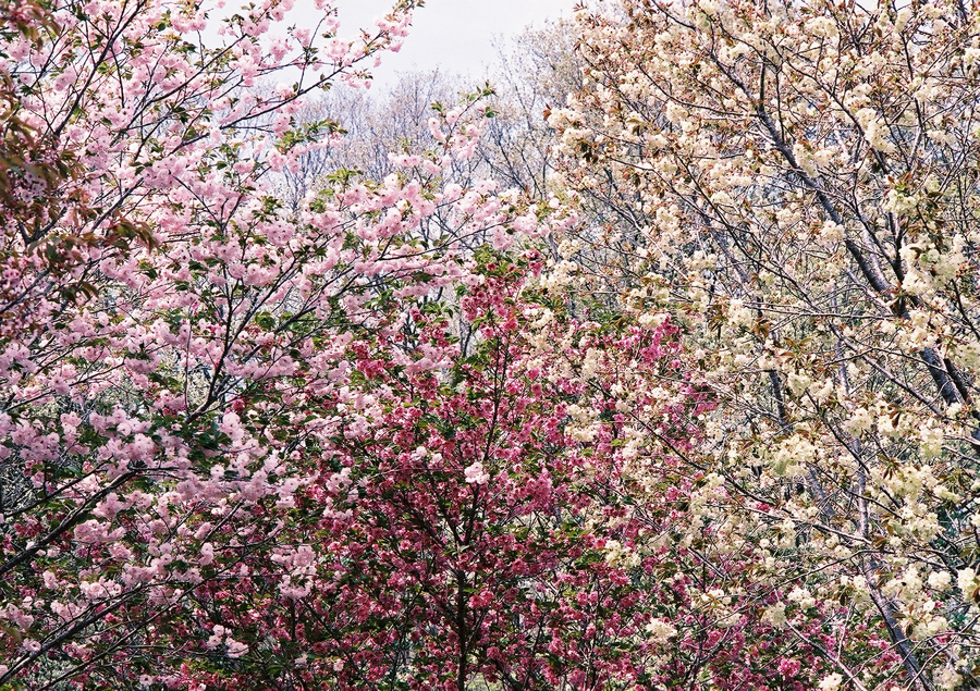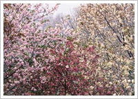 平磯緑地の遊歩道は、海岸と国道二号線の間を東西に延びていて、黒松をはじめ巨木が両側を覆っています。とりわけ、ソメイヨシノとオオシマザクラが間を置かず植えられていて、春4月の初めは、薄ピンクのソメイヨシノと白色のオオシマザクラの共艶を堪能できるのです。 |