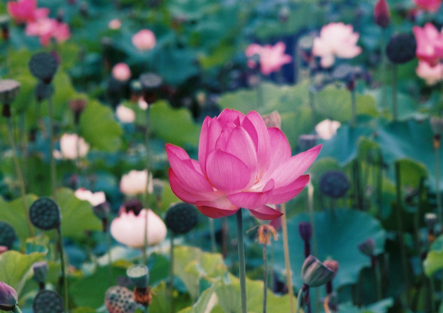 ヤマサ蒲鉾の工場敷地内の蓮が見頃を迎えている、という記事が神戸新聞に写真入りで出ていて、見に行きました。姫路バイパスの中地インターを出て県道67号を北へ。この道は、書写山圓教寺や、ゆめさきの森公園、福崎に行くのに何度も走ったことがあって、途中、道沿いの川の対岸にヤマサ蒲鉾の工場が見えて、こんなところにヤマサ蒲鉾があるのだと思っていたので、迷わずたどり着けました。工場の敷地内の駐車場に車を停めて、案内板を見ながら広い敷地を歩いていくと、工場の北側の一面に、蓮の大輪が咲き誇っていました。私は睡蓮が大好きで、開花の季節になると、毎年、必ず、森林植物園、三木山森林公園の睡蓮を見に行くのですが、清楚な睡蓮と違って、華麗な蓮は、また格別の見応えがあります。