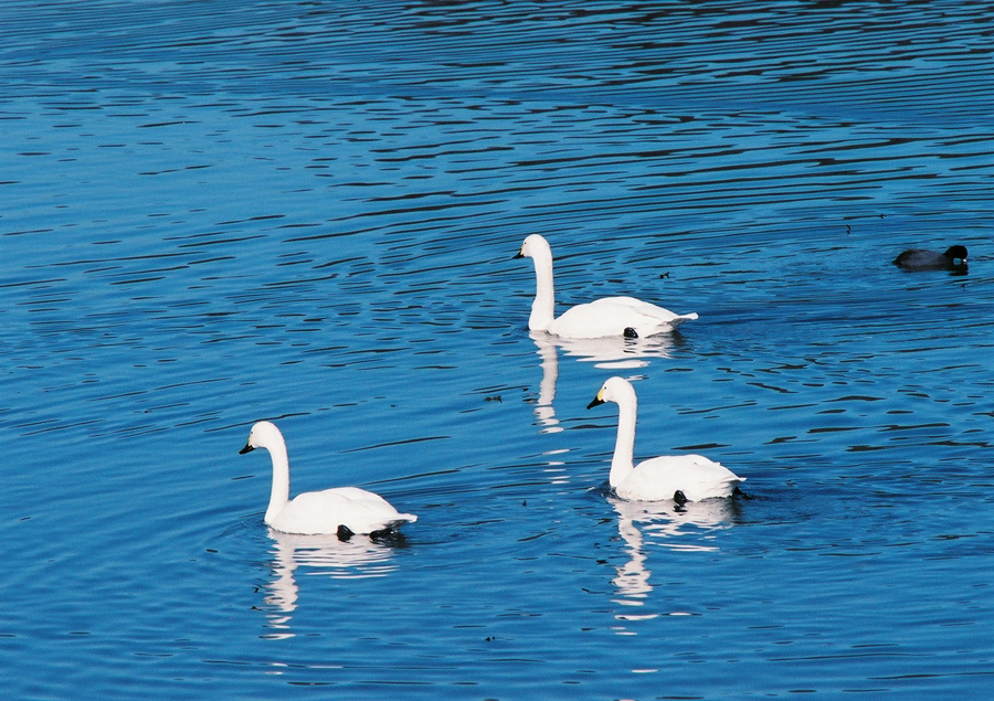 初めて訪れた「チャッタナの森」は、とても気持ちの良い施設で、マネージャーの方も親切で「今晩は新月ですから、きっと星が綺麗ですよ」と教えて下さったのですが、まさしく満天の星、街中では絶対見ることのできない星のキラメキに感動しました。「チャッタナの森」がいたく気に入って、それから毎月、訪れることになったのですが、あの満天の星が撮影出来たら、と行きつけのカメラ屋さんに1000ミリの反射望遠レンズが陳列されていたのを後先考えず購入しました。翌2月、今度こそコハクチョウを見ようと鴨池公園に立ち寄るとコハクチョウが典雅な姿を湖面に浮かべていたのです。買ったばかりの1000ミリの反射望遠レンズで夢中で撮影しました。その夜も「チャッタナの森」の夜空は満天の星だったのですが、フィルムカメラに装着した1000ミリの反射望遠レンズでは、とてもとても撮影不可でした。 |